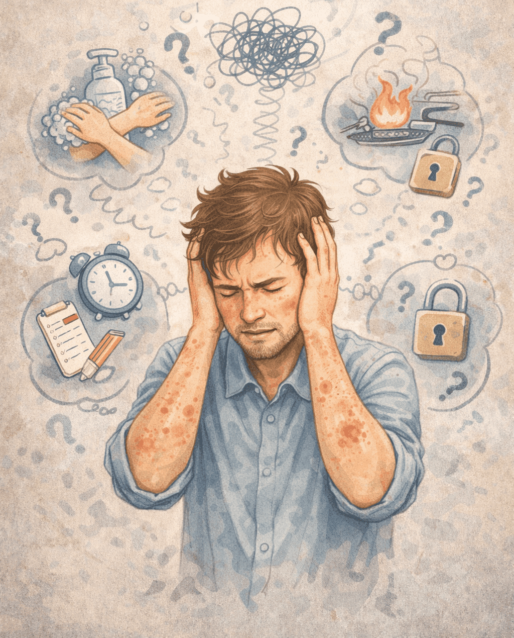 - Психическое напряжение и высокий уровень тревоги: фоновая тревожность и резкие всплески тревоги при попытке сопротивляться навязчивой мысли или нарушить ритуал